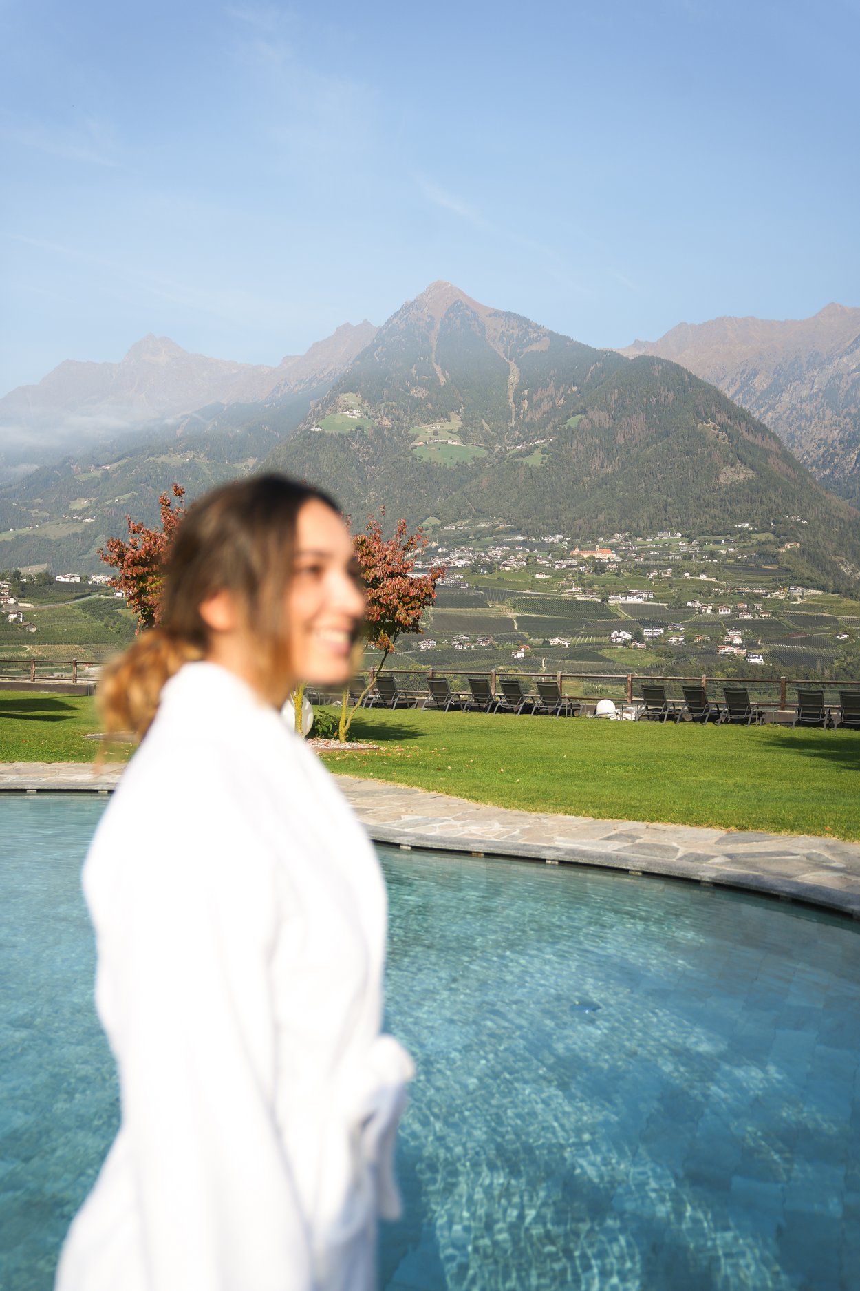 Das Spa unseres Wellnesshotels in Südtirol/Meran ist hell, offen und durchzogen von dem, was Südtirol besonders macht: Natur und Nähe. Im Ruhebereich fällt der Blick in den Garten, im Sommer auf das Glitzern des Wassers, im Winter auf das leise Dampfen des Pools. Saunen und Massagen und Behandlungen schaffen einen Rhythmus aus Bewegung, Wärme und Geborgenheit – sanft wie der Wechsel der Jahreszeiten.